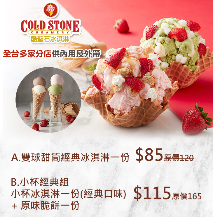 【COLD STONE酷聖石冰淇淋】致力於給予顧客無與倫比的冰淇淋體驗,所呈現的不只是每位消費者心中完美的客製化冰淇淋,更特別的是在消費過程中所產生的深刻歡樂體驗~兼具高品質的新鮮冰淇淋,不僅滋味香醇、風味多元,口感更是無可挑剔,綿密滑順、細緻紮實,每一口都療癒人心,令人無法抗拒、陶醉不已!