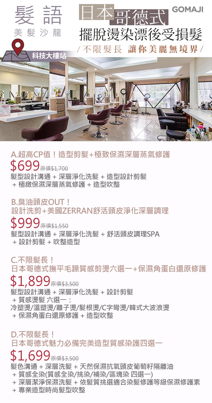 A.超高CP值!造型剪髮+極致保濕深層蒸氣修護 / B.臭油頭皮OUT!設計洗剪+美國ZERRAN舒活頭皮淨化深層調理 / C.不限髮長!日本哥德式撫平毛躁質感剪燙六選一+保濕角蛋白還原修護 / D.不限髮長!日本哥德式魅力必備完美造型質感染護四選一