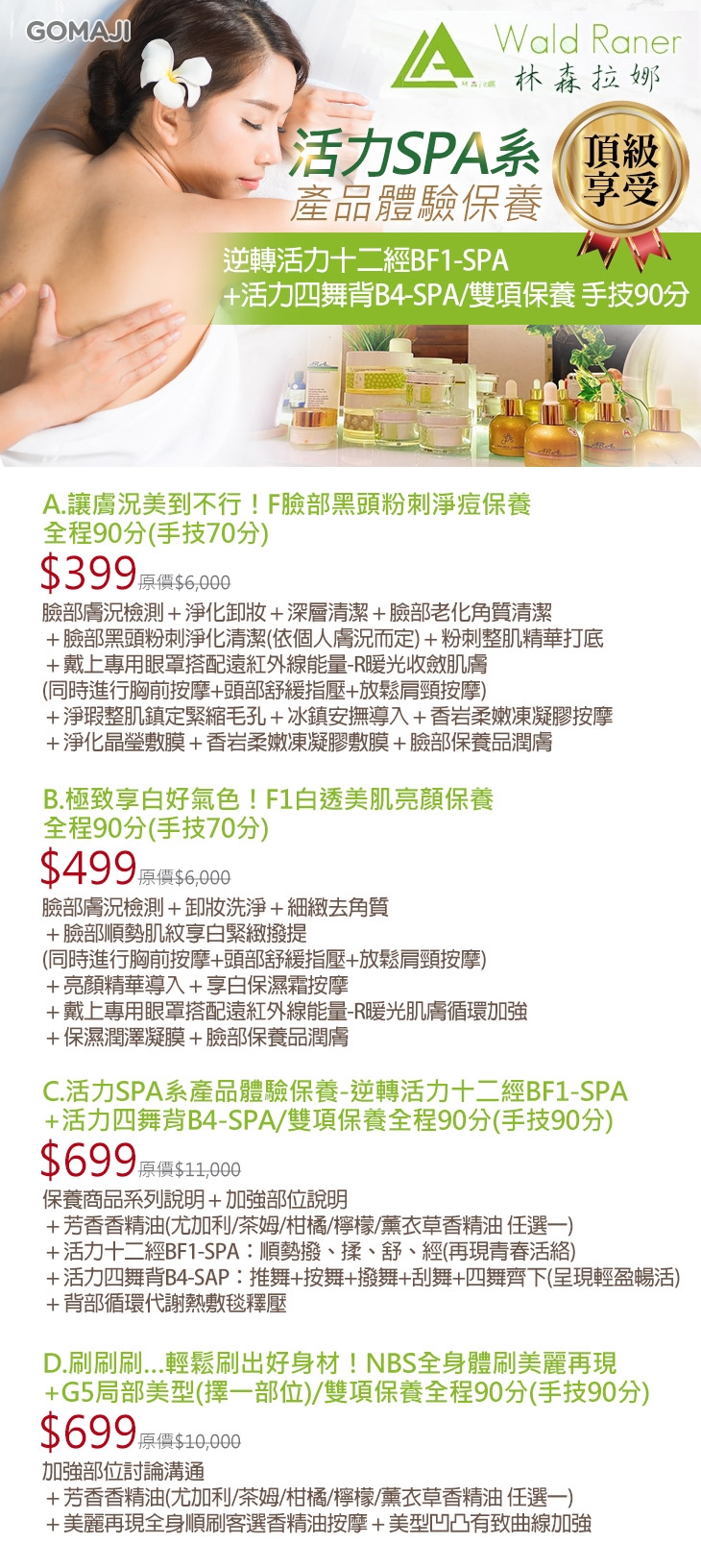 A.讓膚況美到不行!F臉部黑頭粉刺淨痘保養全程90分(手技70分) / B.極致享白好氣色!F1白透美肌亮顏保養全程90分(手技70分) / C.活力SPA系產品體驗保養-逆轉活力十二經BF1-SPA+活力四舞背B4-SPA/雙項保養全程90分(手技90分) / D.刷刷刷…輕鬆刷出好身材!NBS全身體刷美麗再現+G5局部美型(擇一部位)/雙項保養全程90分(手技90分)