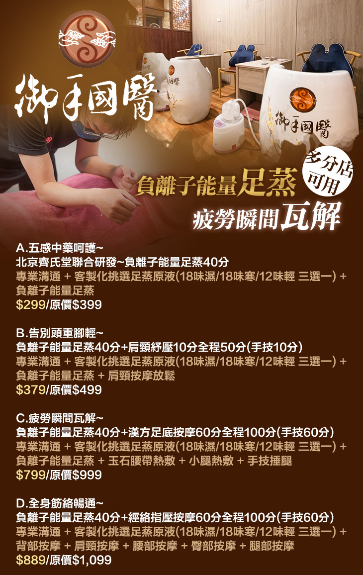 A.五感中藥呵護~北京齊氏堂聯合研發~負離子能量足蒸40分 / B.告別頭重腳輕~負離子能量足蒸40分+肩頸紓壓10分全程50分(手技10分) / C.疲勞瞬間瓦解~負離子能量足蒸40分+漢方足底按摩60分全程100分(手技60分) / D.全身筋絡暢通~負離子能量足蒸40分+經絡指壓按摩60分全程100分(手技60分)