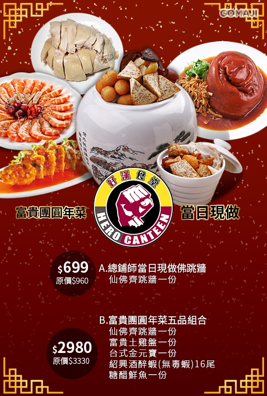 鄰近捷運七張站的好漢食堂,在農曆除夕前推出年菜外帶服務,無論是象徵年年有餘的糖醋鮮魚、代表財源滾滾、招財進寶的台式金元寶,或者與「家」同音(閩南語),意味著 「起家」的富貴土雞盤,還有滿滿一甕應有盡有、年菜必有的美味佛跳牆。