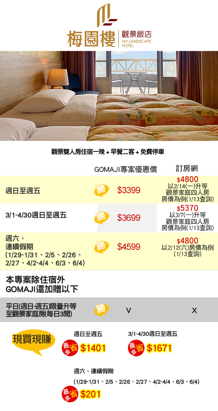 ★ 阿里山梅園樓xGOMAJI獨家首賣!雙人平日限量升等觀景家庭房!真的太好康!