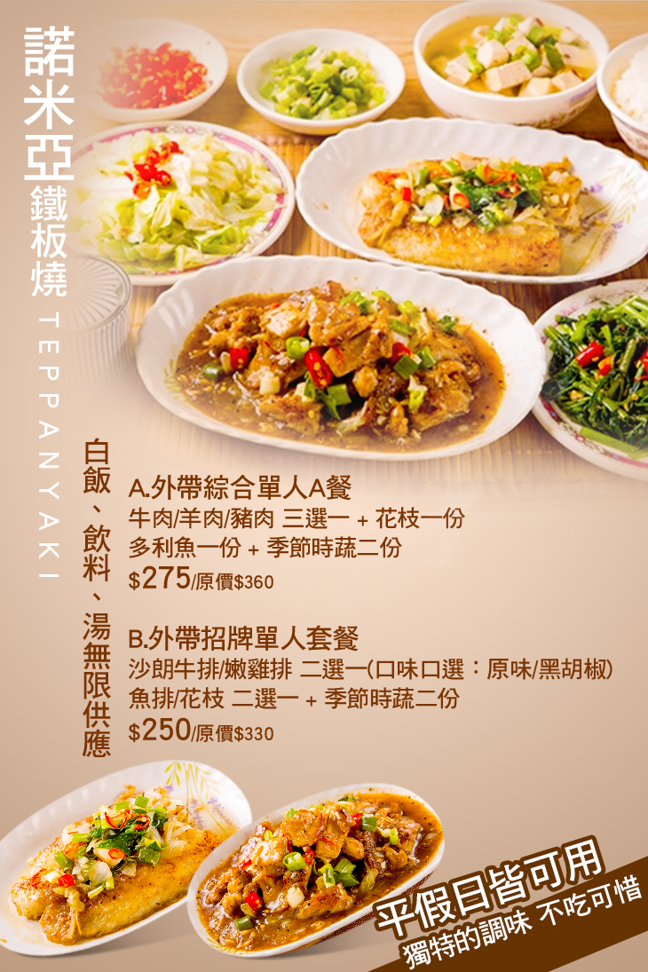 喜愛到處品嚐美食的麻吉注意啦!吃鐵板燒就要呷這一味,歡迎光臨朝聖【諾米亞鐵板燒】!堅持送上五星級美食,卻是只要三星級價位,小資一族來這裡就對了!嚴選新鮮食材搭配主廚精湛廚藝,獨特調味肯定會讓你一吃就愛上!