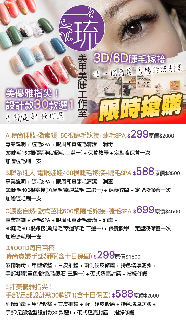 A.時尚裸妝~偽素顏150根睫毛嫁接+睫毛SPA / B.韓系迷人~電眼娃娃400根睫毛嫁接+睫毛SPA / C.濃密自然~歐式芭比600根睫毛嫁接+睫毛SPA / D.#OOTD每日百搭~時尚貴婦手部凝膠(含十日保固) / E.甜美優雅指尖!手部/足部設計款30款選1(含十日保固)