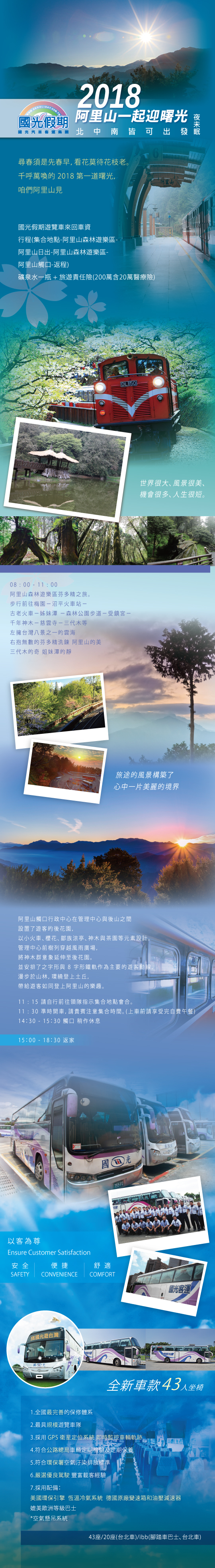 只要999元,即可享有【國光假期】北中南皆可出發!2018一起迎曙光阿里山夜未眠(四排椅)〈含國光假期遊覽車來回車資 + 行程(集合地點-阿里山森林遊樂區-阿里山日出-阿里山森林遊樂區-阿里山觸口-返程) + 礦泉水一瓶 + 旅遊責任險(200萬含20萬醫療險)〉