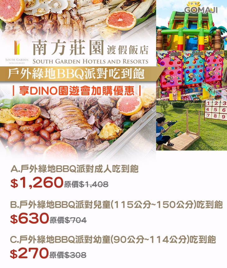 A.戶外綠地BBQ派對成人吃到飽 / B.戶外綠地BBQ派對兒童(115公分~150公分)吃到飽 / C.戶外綠地BBQ派對幼童(90公分~114公分)吃到飽