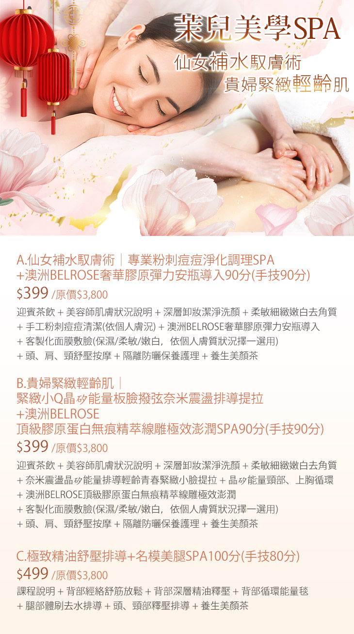 A.仙女補水馭膚術|專業粉刺痘痘淨化調理SPA+澳洲BELROSE奢華膠原彈力安瓶導入90分(手技90分) / B.貴婦緊緻輕齡肌|緊緻小Q晶矽能量板臉撥弦奈米震盪排導提拉+澳洲BELROSE頂級膠原蛋白無痕精萃線雕極效澎潤SPA90分(手技90分) / C.極致精油舒壓排導+名模美腿SPA100分(手技80分)