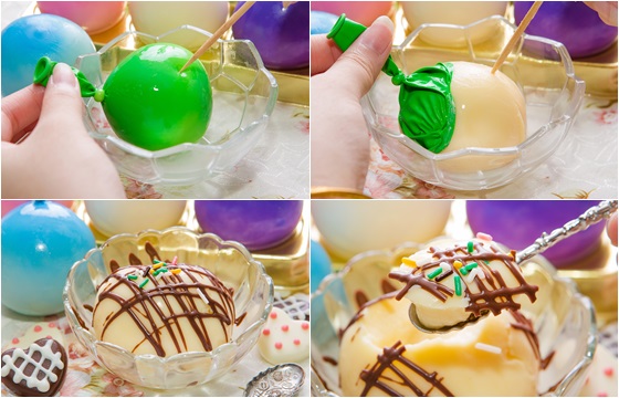 ● 挑顆汽球放入碗中 ● 拉住汽球頭用力"戳"破 ● 加上喜愛醬料享受布丁,好吃又好玩!