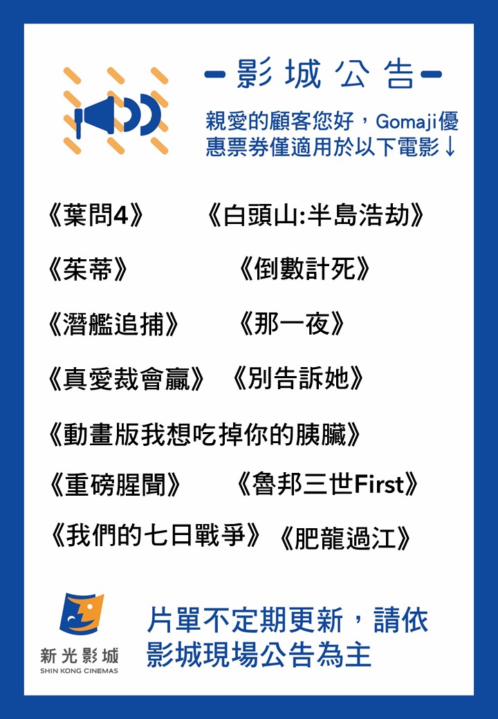 【台中新光影城/台南新光影城】感謝麻吉們熱烈搶購,已全數賣光光。