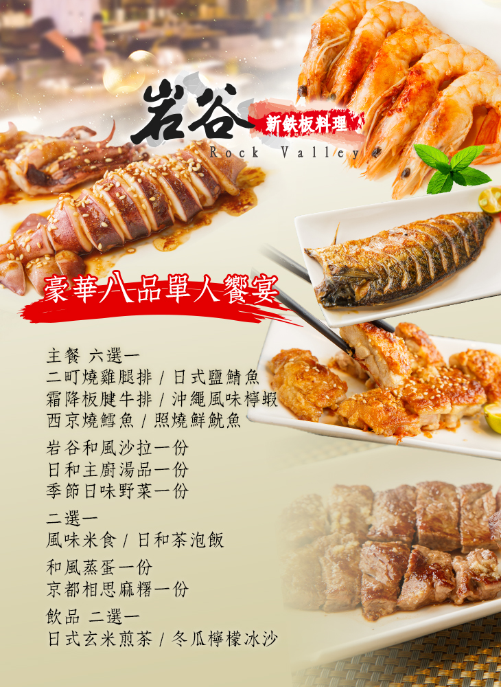 來一趟高貴不貴的奢華鐵板料理之旅吧!超人氣的岩谷新鉄板燒料理,專營優質美味的鐵板燒美食,無論是岩谷雞腿排、菲力牛排、雪花松阪豬等皆是店內人氣招牌首選。此外,本次合作台北店,強打推出豪華八品單人饗宴,機會難得,要搶要快!