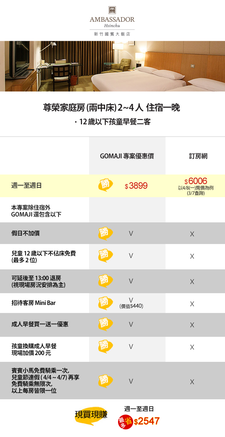 ➤ 尊榮家庭房提供兩中床,最多可入住四位大人+兩位12歲以下兒童(平均每人974元!)