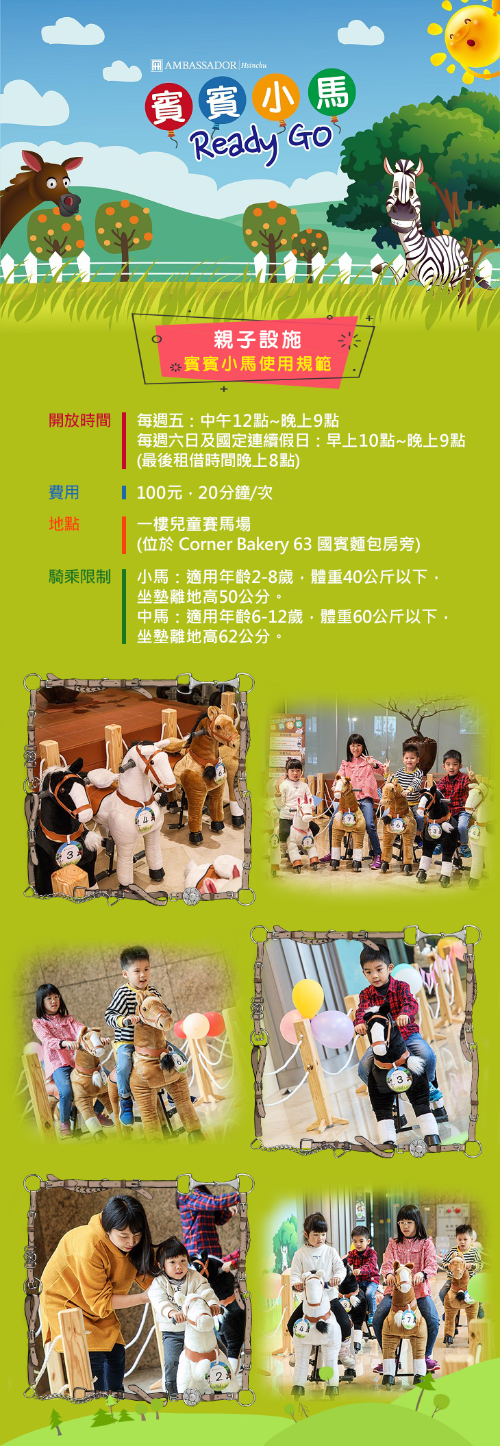※賓賓小馬每次騎乘時間20分鐘,如超過免費騎乘次數或人數需加價100元/次