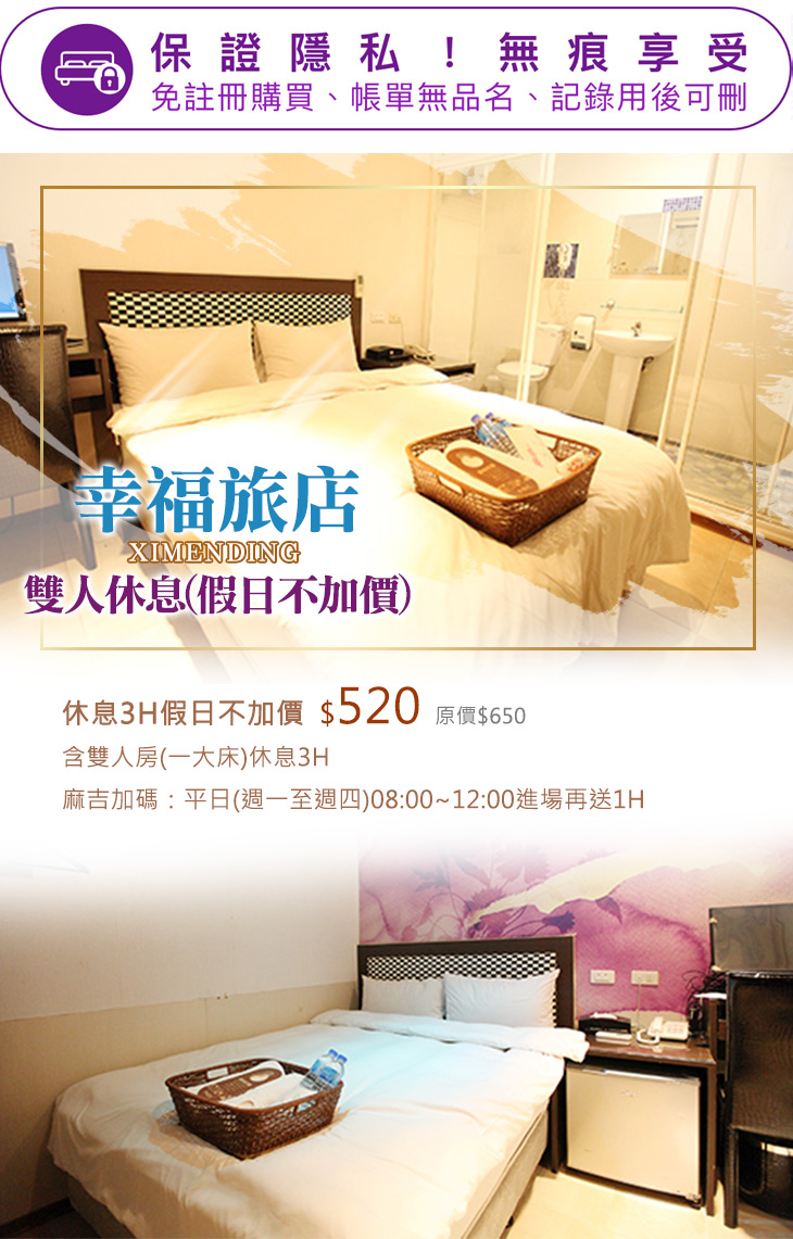 逛街逛累了就到幸福旅店,鬧中取靜的獨立空間,不受外界干擾,提供都市愛侶一處靜謐角落,擁抱甜蜜倆人時光!