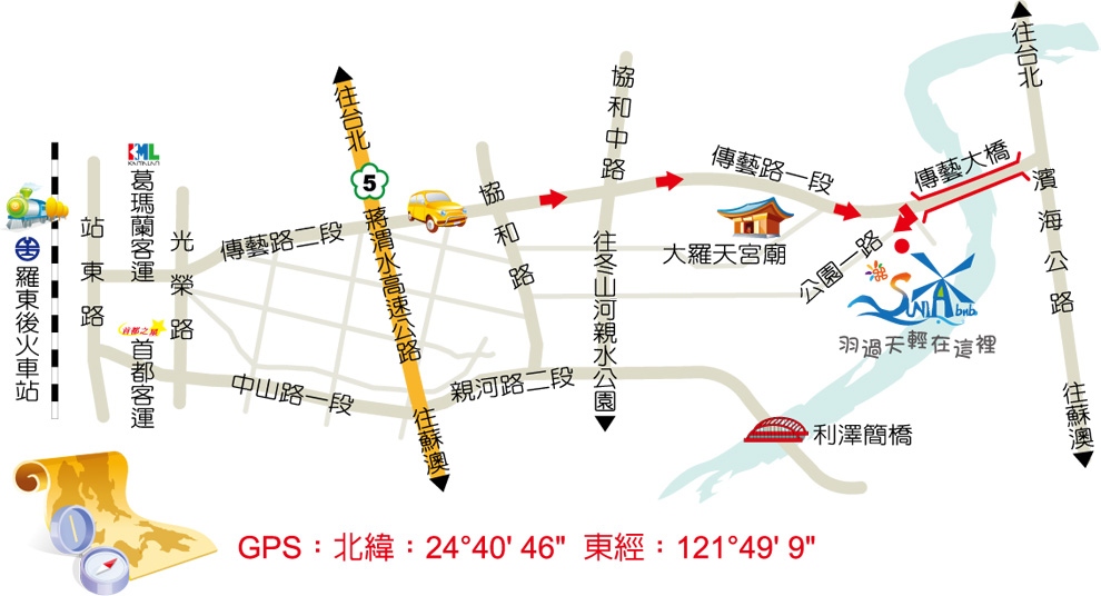 蘇花公路下往國道5號(往頭城、台北方向)→由羅東交流道下至傳藝路一段右轉直行2.7公里→傳藝橋前的小路右轉再右轉→羽過天輕渡假民宿