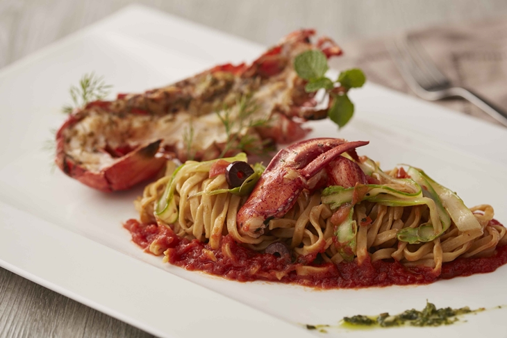 以義大利小麥粉加上蛋黃,手工桿出的自製寬扁麵,是以蒜片、鯷魚、橄欖、番茄丁、白酒、蘆筍片及龍蝦汁一同拌炒;盛盤時底層舖上橄欖油炒大碎、洋蔥碎、番茄碎、羅勒的番茄醬汁;最後再搭配奶油焗烤過後的龍蝦,灑上蒔蘿及薄荷裝飾。Q彈有勁的麵條,充分吸入飽滿的主廚獨家小秘方-龍蝦汁,海鮮鮮美滋味中富有蔬菜甘甜清香,佐以溫潤酸香的番茄醬汁,再搭配肉質鮮甜的緬因龍蝦,輕酸與鮮甜的滋味,大海之味蔓延於口中,最適合喚醒春夏味蕾,微酸微甜縈繞舌尖。