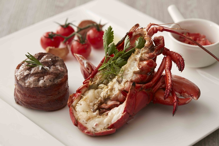 將培根包覆菲力的外層,以百里香、胡椒、大蒜醃製,以炭烤方式控制熟成度,將外層表面烤至金黃酥脆,內層卻完美保留粉紅色的鮮嫩肉質,咬下口中充滿豐厚香甜的肉汁;選用緬因波士頓龍蝦,以炭烤方式烹調至肉質最佳鮮美多汁狀態,最後撒上橄欖油、胡椒鹽及清爽細緻的莎莎醬一同享用,感受純粹天然海味;另外搭配烤過的串採番茄,番茄皮薄圓潤,寶石紅般閃耀誘人,輕酸與鮮甜的滋味,將龍蝦海香甜味蔓延於口中。