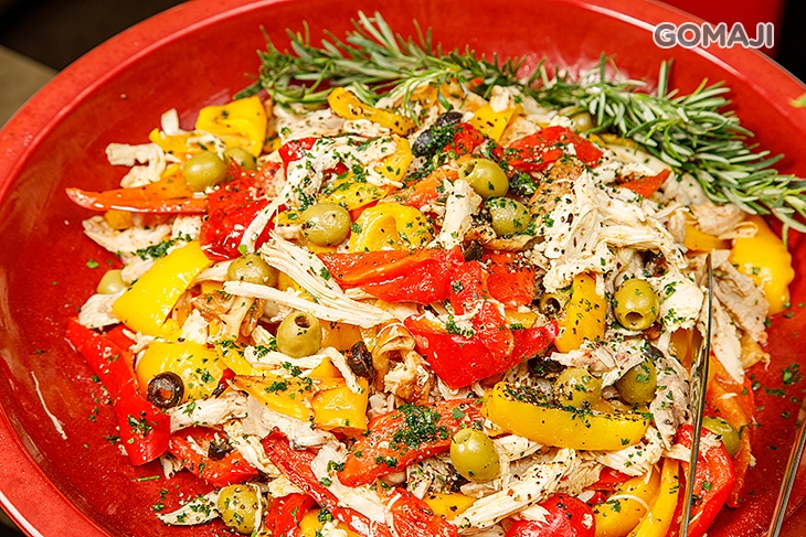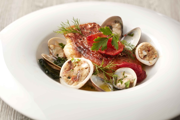 在鮮魚的中間塞入大蒜、風乾番茄、巴西利、希臘橄欖、胡椒鹽、白酒及龍蝦汁,再加入些許的麵包粉、烤過的杏仁粉、蛋白,以170度的溫度蒸烤15分鐘後取出;將切絲的紅黃椒、油封番茄、大蒜、番茄及青醬拌在一起舖底;最後放上以橄欖油、蒜片、白酒、檸檬汁、奶油、巴西利及羅勒一同烹煮的白蝦、透抽、蛤蠣及淡菜,以及拌入蘆筍、茴香、薄荷、炭烤櫛瓜片、檸檬油醋。鮮魚肉質細嫩多汁,佐以四種白蝦、透抽、蛤蠣及淡菜烹煮過的醬汁,海鮮的鹹香,如綣綣浪花不斷襲來的幸福滋味衝擊著味蕾。