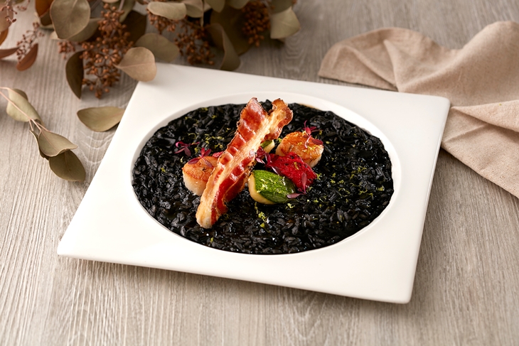 將洋蔥、西芹、紅蘿蔔爆香,再加上白酒與墨魚囊湯汁一同燜煮義大利米粒,收汁前加上馬斯卡彭起司、檸檬汁、檸檬皮,盛盤放上以橄欖油香煎過的北海道干貝以及香脆的義大利培根。以蔬菜湯汁調整墨魚燉飯燜煮的濃稠度,鮮美海味中富有蔬菜甘甜清香,最後佐以起司和檸檬皮,增添了起司風味及清爽不膩的淡淡檸檬香氣。