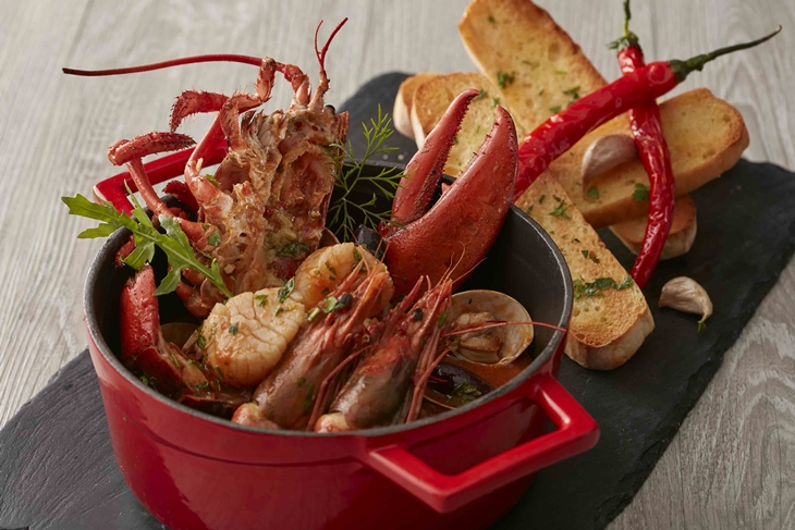 ❖托斯卡納風格辣味燉煮海鮮襯蒜味普切塔 (北海道干貝, 草蝦, 龍蝦半隻, 每日鮮魚)/雙人NT$3,880