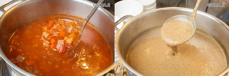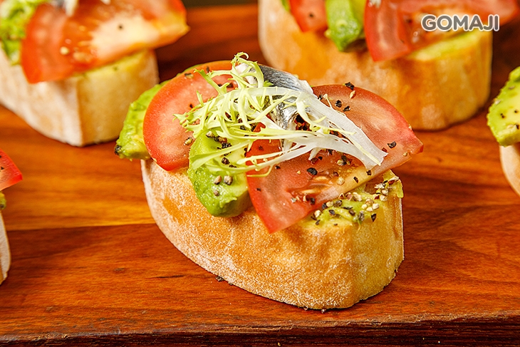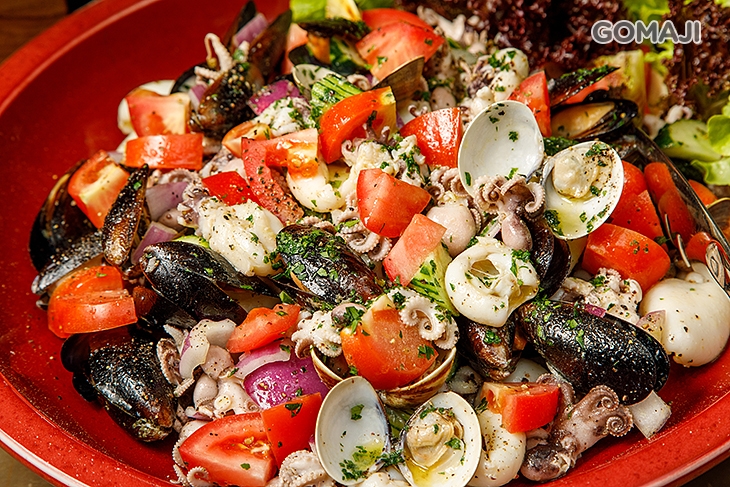 海味馥郁的湯底,是以魚骨、洋蔥、西芹、紅蘿蔔、月桂葉炒過,燉煮約40分鐘後過濾出的魚高湯。以蒜片、義大利乾辣椒爆香,加上番茄、鯷魚、蛤蠣及白酒燒煮過,再加入魚高湯及些許龍蝦汁後,放入北海道干貝、魚肉、透抽、大草蝦、龍蝦及希臘黑橄欖。香醇的魚高湯及龍蝦汁飽滿吸附於海鮮料之中,酸甜鮮美滋味在口中釋放,再搭配蒜味普切塔麵包沾附湯汁,舌尖上的味蕾如海中盈舞。
