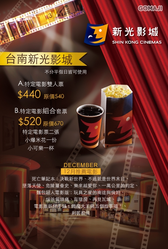 台灣本土國片最近話題討論度高到破表,麻吉的電影魂是否也燃起熊熊烈火?現在超值優惠的電影資訊要報給你(妳)知!想看電影時就來【台南新光影城】吧!現在只要440元即可獲得特定電影雙人票、520元就能享有特定電影票二張 + 小爆米花一份 + 小可樂一杯!趕緊查詢一下強檔大片的上映時間,準備大啖爆米花欣賞電影囉!