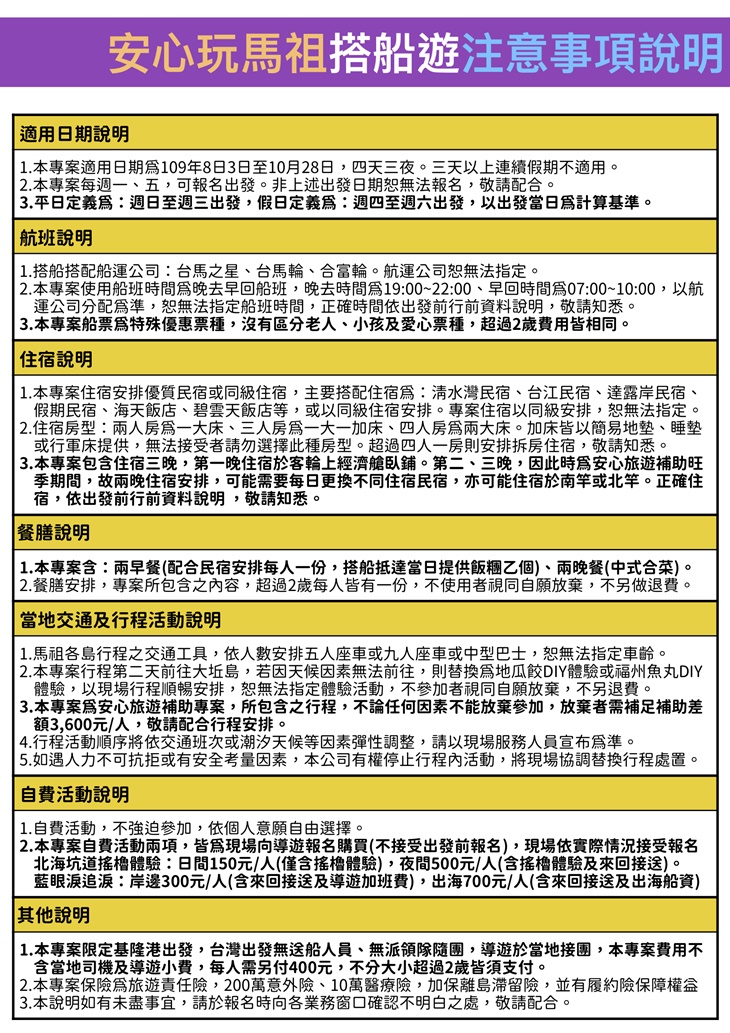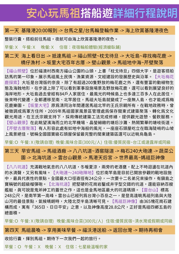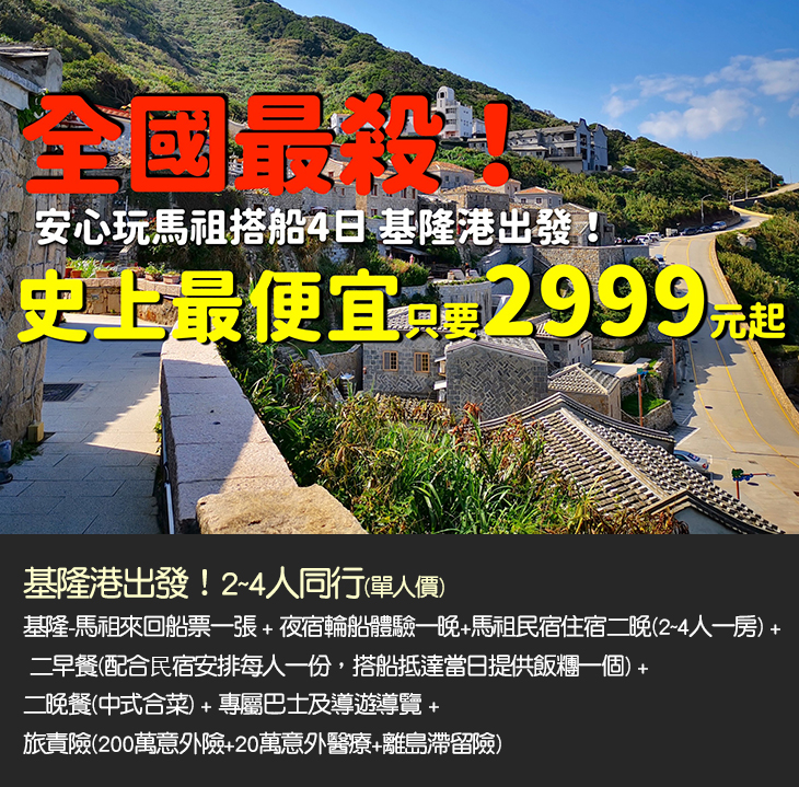 只要2999元,即可享有【安心玩馬祖搭船4日(晚去早回)】基隆港出發!2~4人同行(單人價)〈含基隆-馬祖來回船票一張 + 夜宿輪船體驗一晚+馬祖民宿住宿二晚(2~4人一房) + 二早餐(配合⺠宿安排每人一份,搭船抵達當日提供飯糰一個) + 二晚餐(中式合菜) + 專屬巴士及導遊導覽 + 旅責險(200萬意外險+20萬意外醫療+離島滯留險)〉