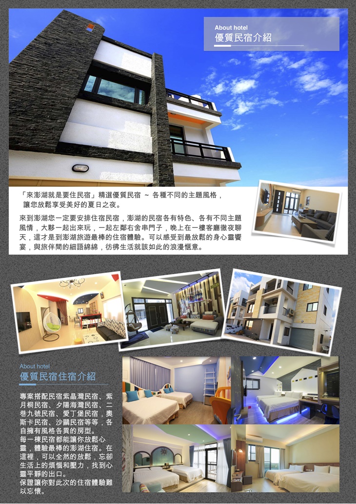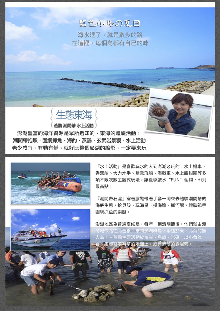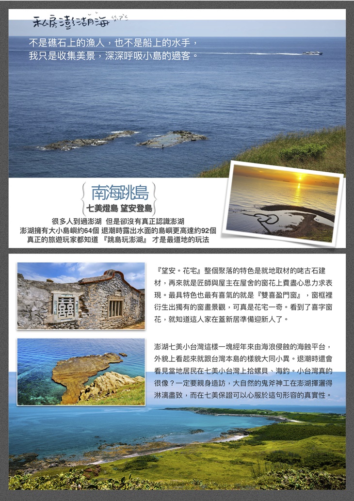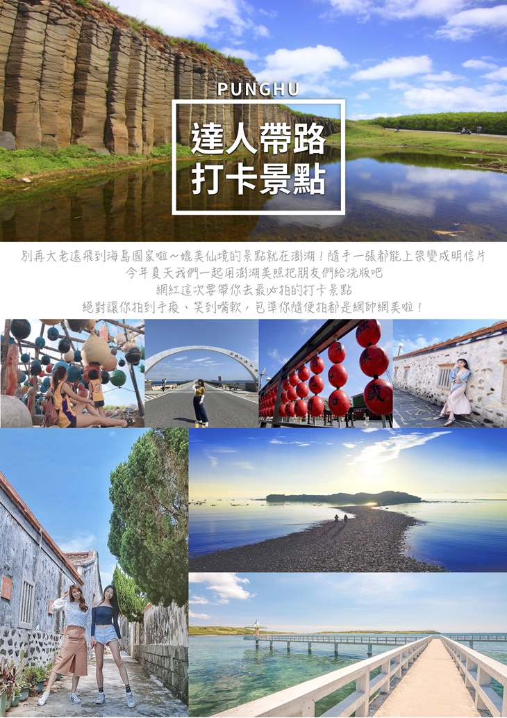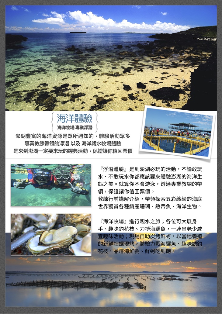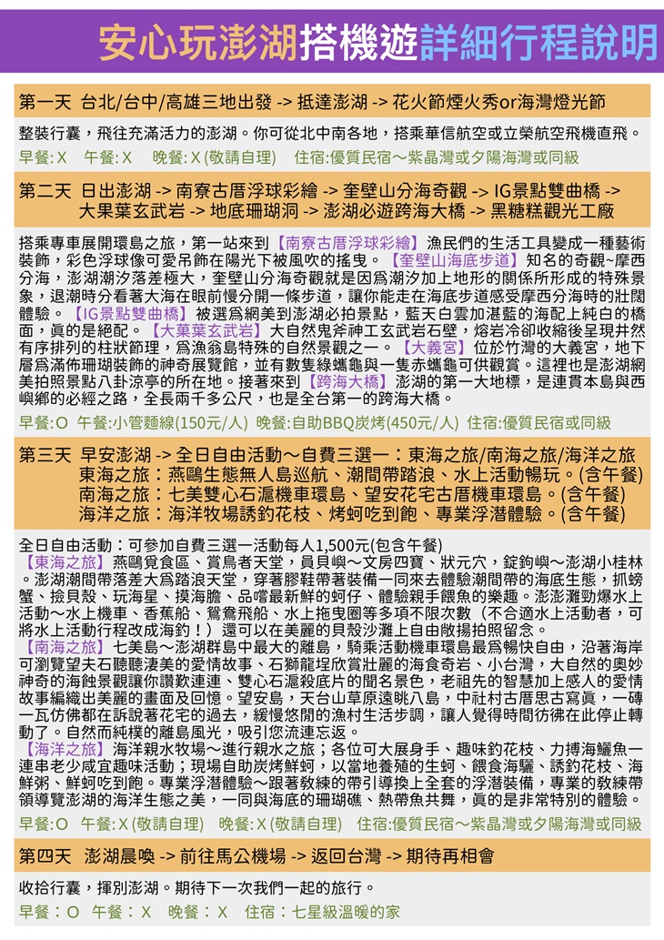 | 安心玩澎湖搭機4日(晚去早回) | - 北中南皆可出發!2~4人同行(單人價) 澎湖每一處都像明信片一般那麼美麗!對於終日身處高樓大廈的我們,是時候規劃一個假期,放下工作、書本,前往這美得令人驚嘆的島嶼,盡情玩耍、釋放壓力,感受天然景致的美好!