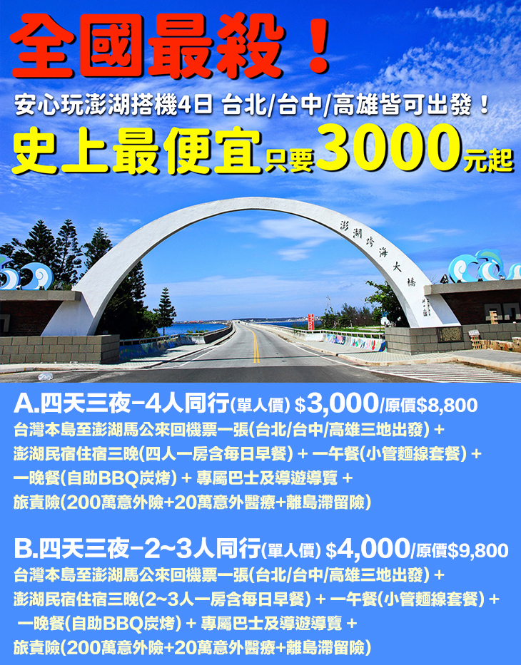 只要3000元起,即可享有【安心玩澎湖搭機4日(晚去早回)】北中南皆可出發!2~4人同行(單人價)〈含A.(4人同行)/B.(2~3人同行),方案皆含台灣本島至澎湖馬公來回機票一張(台北/台中/高雄三地出發) + 澎湖民宿住宿三晚(含每日早餐) + 一午餐(小管麵線套餐) + 一晚餐(自助BBQ炭烤) + 專屬巴士及導遊導覽 + 旅責險(200萬意外險+20萬意外醫療+離島滯留險)〉