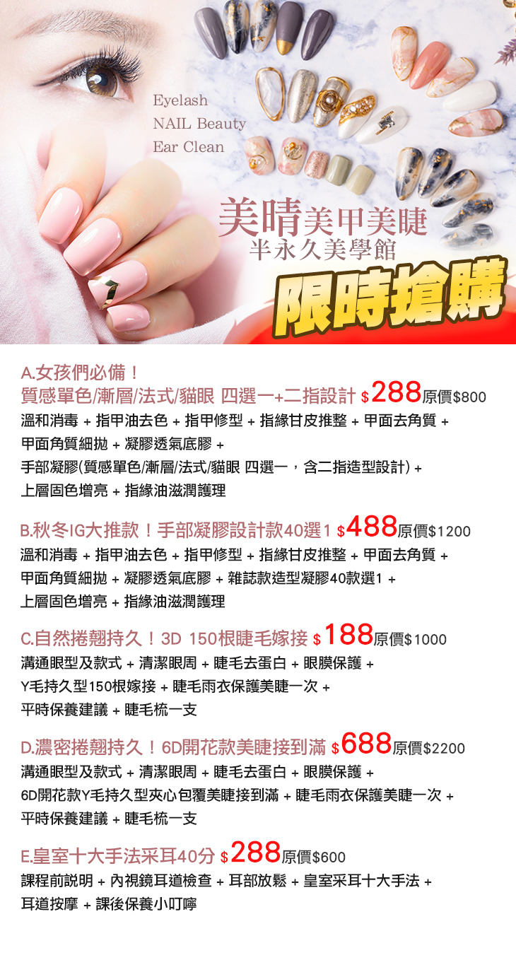 A.女孩們必備!質感單色/漸層/法式/貓眼 四選一+二指設計 / B.秋冬IG大推款!手部凝膠設計款40選1 / C.自然捲翹持久!3D 150根睫毛嫁接 / D.濃密捲翹持久!6D開花款美睫接到滿 / E.皇室十大手法采耳40分