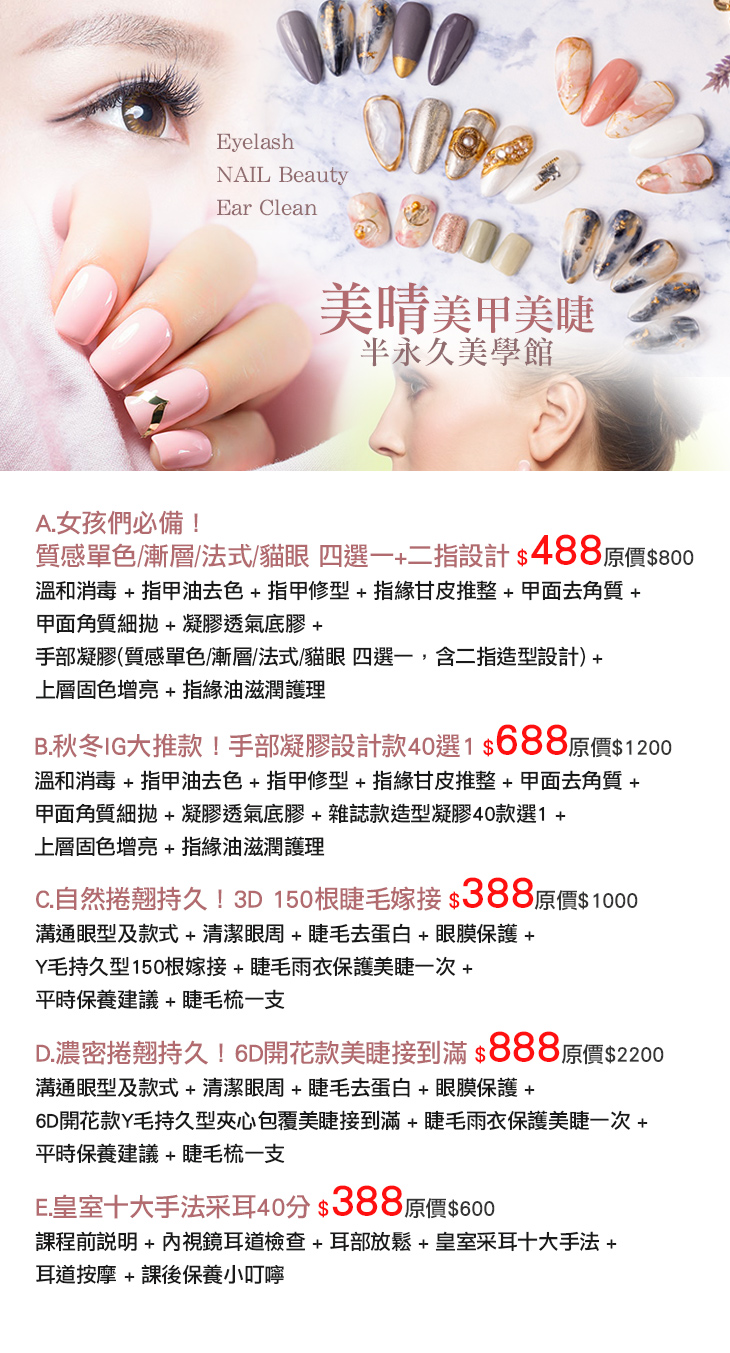 A.女孩們必備!質感單色/漸層/法式/貓眼 四選一+二指設計 / B.秋冬IG大推款!手部凝膠設計款40選1 / C.自然捲翹持久!3D 150根睫毛嫁接 / D.濃密捲翹持久!6D開花款美睫接到滿 / E.皇室十大手法采耳40分