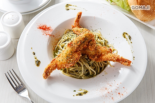 青醬義大利麵佐椰香炸蝦