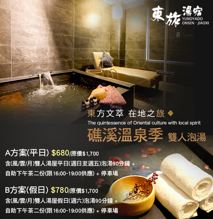 東旅源自於對東方禪風的想望、湯宿則代表礁溪獨特的泡湯文化,帶著些許日本味的精緻品味。台灣的蘭陽平原,也具有相似的景緻,被高山所環繞,加上清澈無污染的河流湖泊相伴,可說是寶島的淨土之一,也是最佳的休閒勝地。湛藍晴空下、漫遊於蘭陽平原,迎著涼涼輕風,有如獨立人間般的世外桃源,形成一幅難以忘懷的美景。
