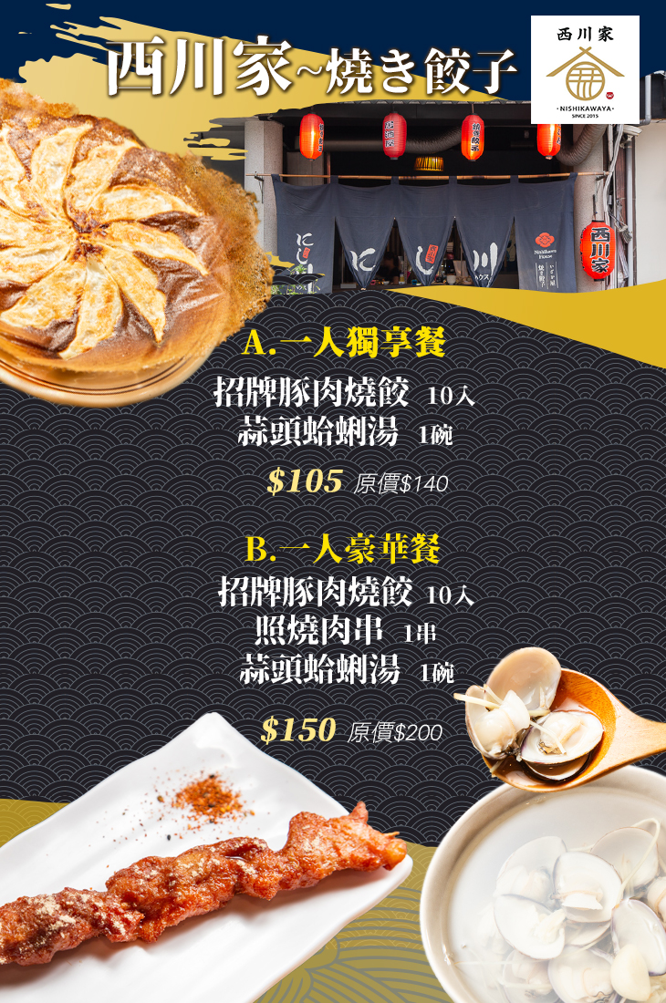【西川家~燒き餃子】是一家專賣日式煎餃的小酒館,也是老闆夢想的發源地!體認到現今人們在生活與工作兩者間繁忙的辛苦,希望提供一處讓正在為生活、為工作努力打拼的七、八年級生,能有一處可以在下班之後好好吃飯、好好休息、聊天的地方。此外,在料理烹飪製作上,更不同於一般餐廳,使用100%橄欖油煎餃子,餃子裡頭的內餡更是使用新鮮豬肉秘方醃漬搭配翠綠高麗菜與粉蔥,以及最好的香配料調配後現包製成,最後再急速冷凍鎖住湯汁、現點現煎,讓餃子嚐起來不僅皮酥汁多,更擁有自家特色。