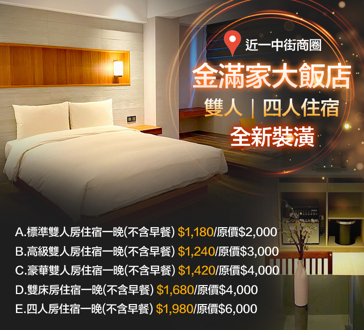 位於台中市北區,地點鄰近一中商圈,優越的地理位置,大大滿足您的購物慾,輕鬆遊玩台中!【金滿家大飯店】深刻了解旅客們的需求,透過精心的設計,打造舒適、溫馨、質感兼具的多元房型,期盼每位旅人來到這裡都能擁有愉悅心情,很適合壓力大的城市人來這裡放鬆,將一切煩惱通通拋開唷!