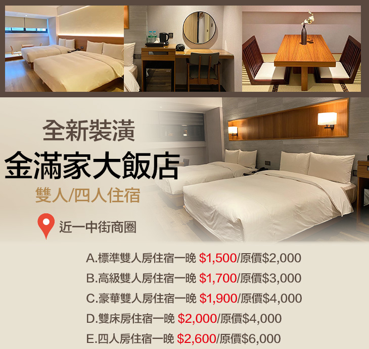 位於台中市北區,地點鄰近一中商圈,優越的地理位置,大大滿足您的購物慾,輕鬆遊玩台中!【金滿家大飯店】深刻了解旅客們的需求,透過精心的設計,打造舒適、溫馨、質感兼具的多元房型,期盼每位旅人來到這裡都能擁有愉悅心情,很適合壓力大的城市人來這裡放鬆,將一切煩惱通通拋開唷!