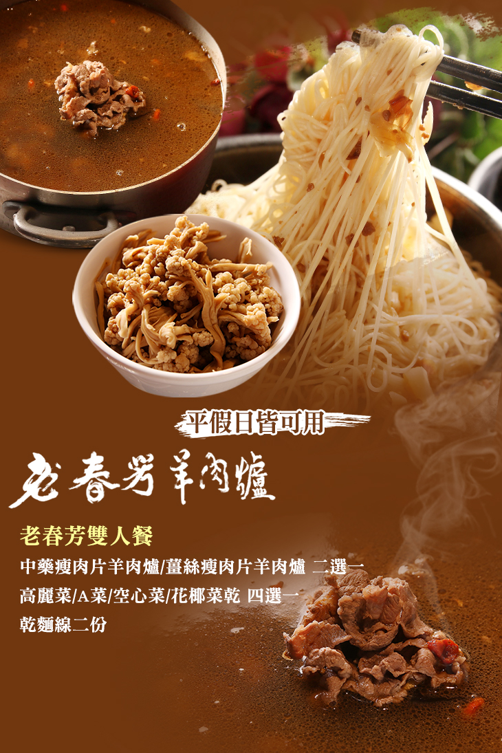 中藥瘦肉片羊肉爐/薑絲瘦肉片羊肉爐 二選一 + 高麗菜/A菜/空心菜/花椰菜乾 四選一 + 乾麵線二份