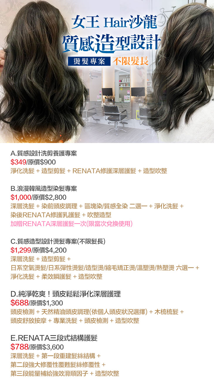 A.質感設計洗剪養護專案 / B.浪漫韓風造型染髮專案 / C.質感造型設計燙髮專案(不限髮長) / D.純淨乾爽!頭皮鬆鬆淨化深層護理 / E.RENATA三段式結構護髮