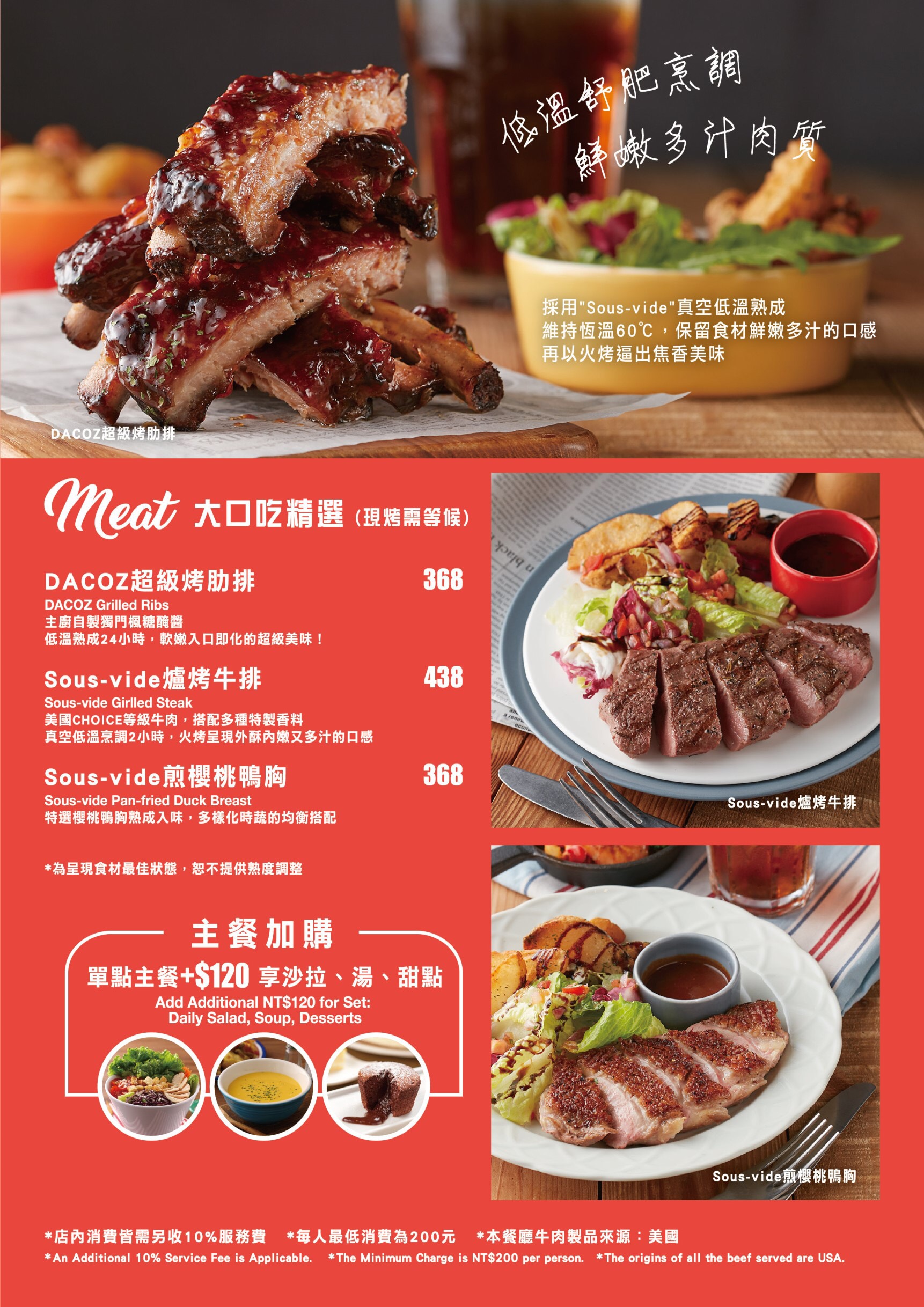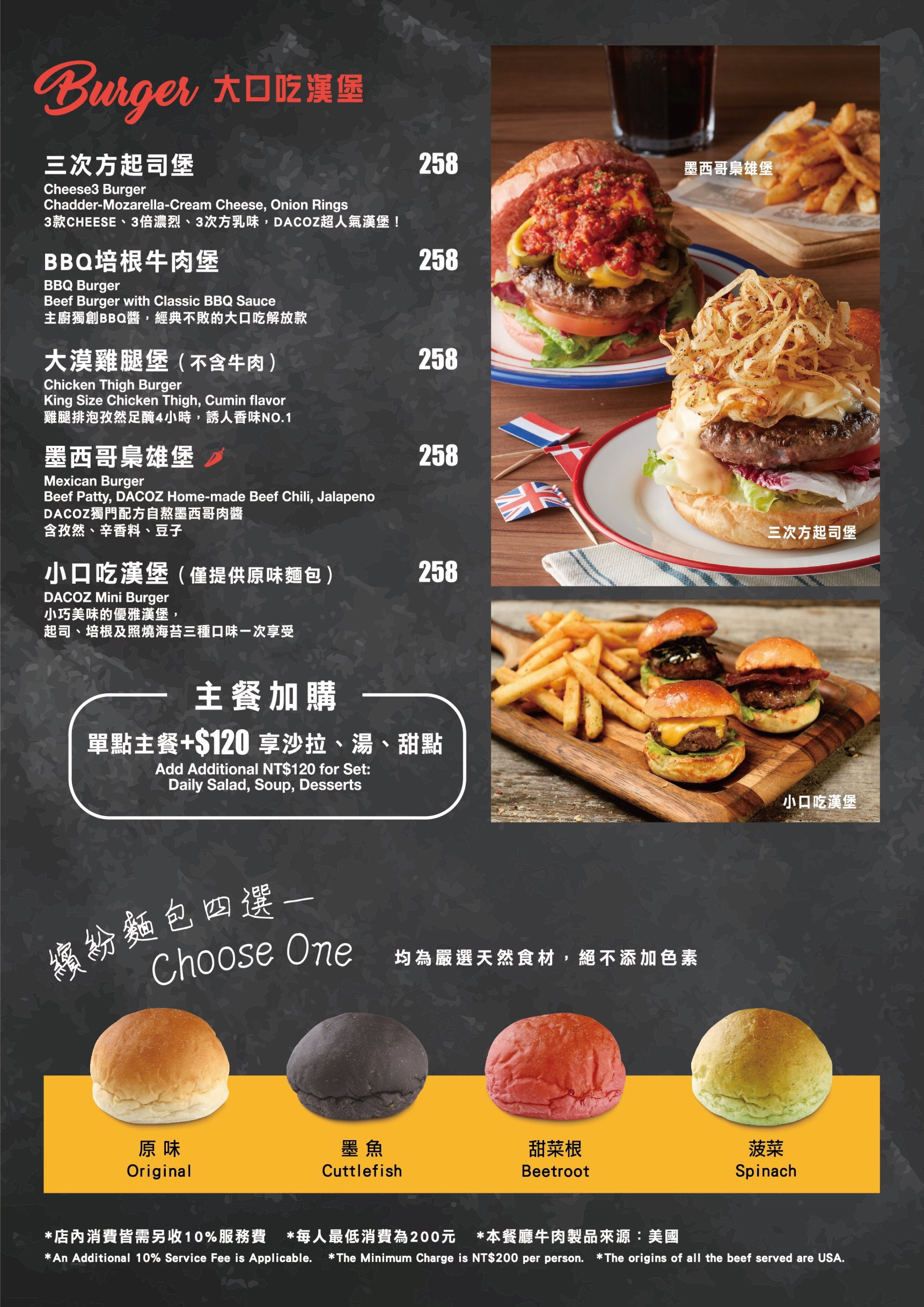 這回只要199元即可享有300元的等值消費(僅限平日使用)!非點不可西班牙海鮮烤飯、羅勒牛排烤飯、鮮蝦菇菇義大利麵、Sousvide 爐烤牛排、DACOZ超級烤肋排、三次方起司堡、墨西哥梟雄堡、可愛漢堡SUPER餐、小口吃漢堡、白蘭地蒜辣蝦、西班牙香料烘蛋!還等什麼?趕緊預約前來大啖別具特色的美式漢堡!