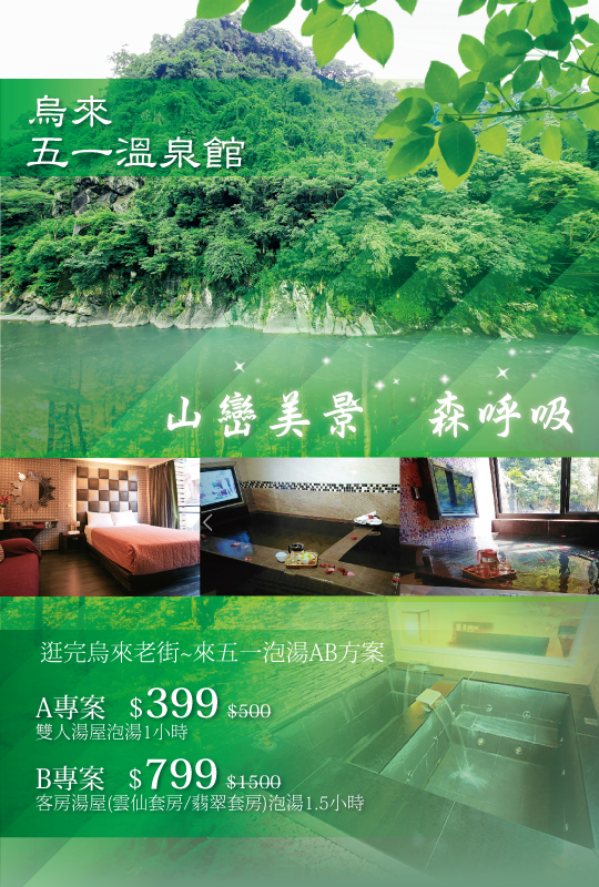 【五一溫泉館】座落於烏來南勢溪畔,風景秀麗,距離烏來老街與台車站步行約1分鐘的路程,鬧中取靜的絕佳地理位置,是造訪烏來不可錯過的休憩站!