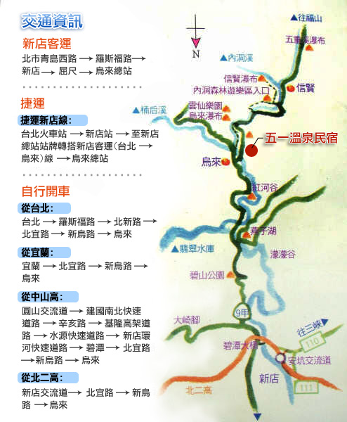 從新烏路一直上來,經過春秋烏來之後再往前約100公尺從右邊二號橋走經過收費亭之後再往前走約100公尺後從左邊下坡的溫泉路直駛進來約1分鐘即會看到五一溫泉民宿。