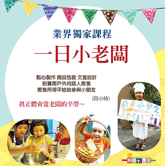 許多年用心經營下,廚房小學堂擁有許多創新、深度、多元的主題課程及假期營隊。內容紮實、萃取精華學習,每每都獲得極高的評價,其中「一日小老闆體驗」、及「環遊世界做點心」最受孩童的喜愛。同時讓孩子的生活技能成長大幅躍進、豐富味覺體驗,培養手作烹調的興趣,同時優化學習表現與人際關係。