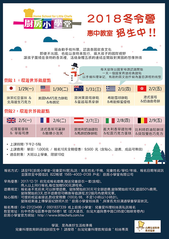 【廚房小學堂】一切從女兒樂樂開始,廚房小學堂創辦人郭珍貝老師專注在兒童料理教育教室。創辦人以留學英國餐旅管理專業背景與多年從事餐旅顧問經驗,為當時兩歲的樂樂實踐以廚房為中心的兒童教養學。 徹底地把「做、中、學」完全融入在教學。 因此教室課程面向涵蓋學齡前兒童到國小國中等,滿足各個發展階段的需要。不論是烘焙點心、中西式料理,皆可以在老師細心、熱情的陪伴引導下,開心的完成作品!