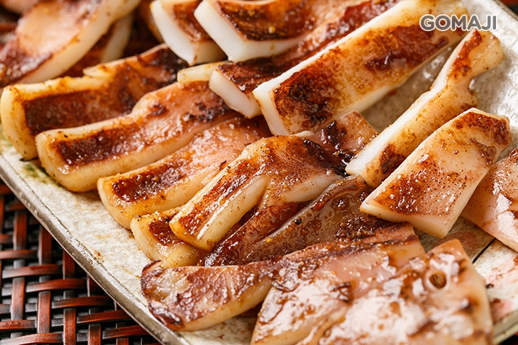 肥美新鮮的現烤魷魚,涮上店家自製的獨門烤醬後,風味更佳,趁熱品嚐,軟Q有嚼勁,魷魚專屬香氣在嘴裡不斷散發,單吃品嚐深海食材那天然的美味,或佐檸檬汁一同享用,清爽不油膩,口感一級棒!