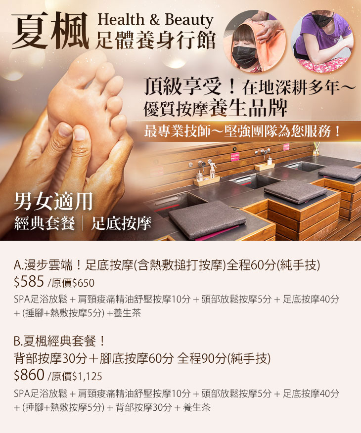 A.漫步雲端!足底按摩(含熱敷搥打按摩)全程60分(純手技) / B.夏楓經典套餐!背部按摩30分+腳底按摩60分 全程90分(純手技)