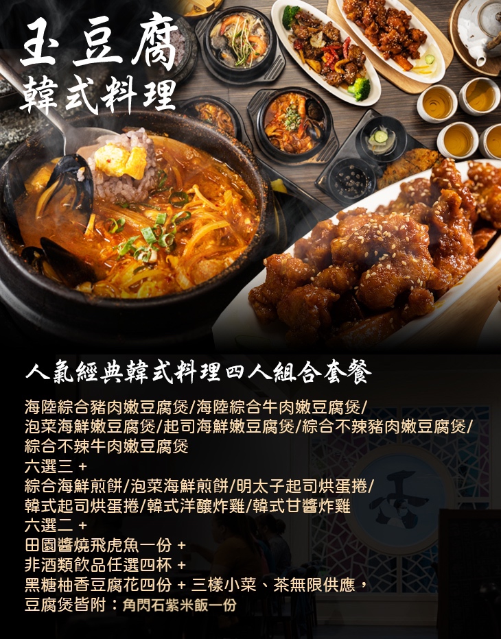 海陸綜合豬肉嫩豆腐煲/海陸綜合牛肉嫩豆腐煲/泡菜海鮮嫩豆腐煲/起司海鮮嫩豆腐煲/綜合不辣豬肉嫩豆腐煲/綜合不辣牛肉嫩豆腐煲 六選三 + 綜合海鮮煎餅/泡菜海鮮煎餅/明太子起司烘蛋捲/韓式起司烘蛋捲/韓式洋釀炸雞/韓式甘醬炸雞 六選二 + 田園醬燒飛虎魚一份 + 非酒類飲品任選四杯 + 黑糖柚香豆腐花四份 + 三樣小菜、茶無限供應,豆腐煲皆附:角閃石紫米飯一份〉