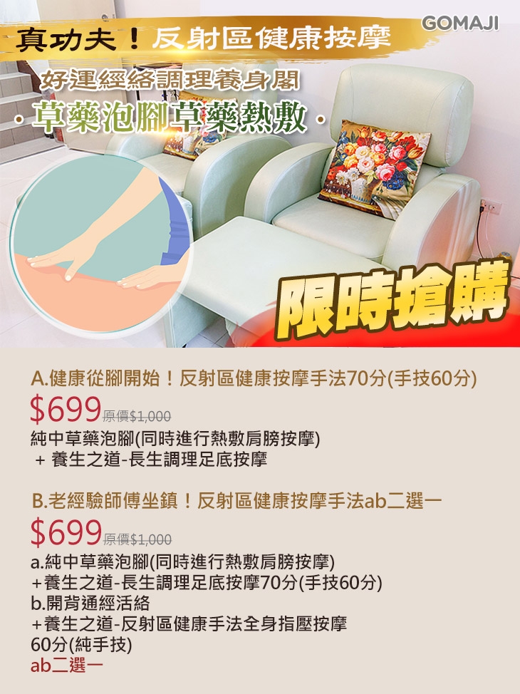 〈a.純中草藥泡腳(同時進行熱敷肩膀按摩)+養生之道-長生調理足底按摩70分(手技60分) / b.開背通經活絡+養生之道-反射區健康手法全身指壓按摩60分(純手技) ab二選一〉