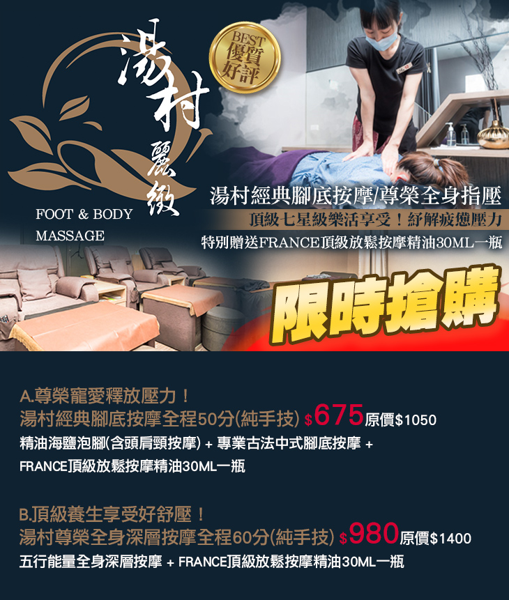 A.尊榮寵愛釋放壓力!湯村經典腳底按摩全程50分(純手技) / B.頂級養生享受好舒壓!湯村尊榮全身深層按摩全程60分(純手技)