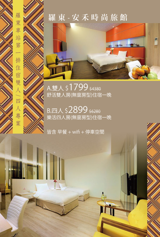安禾時尚旅館坐落於羅東鎮之交通樞紐中心,鄰近羅東夜市、羅東林場文化園區、羅東文化工場等具有宜蘭特色之觀光景點。