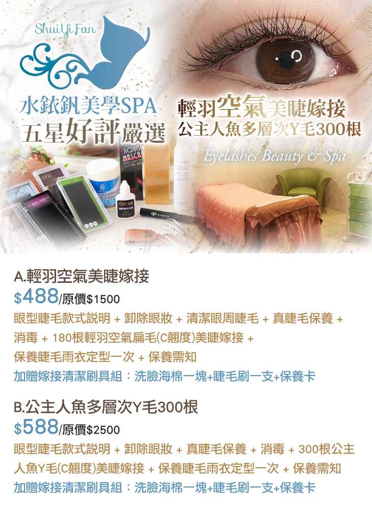 〈眼型睫毛款式說明 + 卸除眼妝 + 真睫毛保養 + 消毒 + 300根公主人魚Y毛(C翹度)美睫嫁接 + 保養睫毛雨衣定型一次 + 保養需知〉加贈嫁接清潔刷具組:洗臉海棉一塊+睫毛刷一支+保養卡