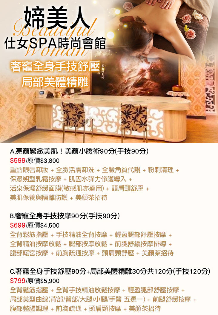 A.亮顏緊緻美肌!美顏小臉術90分(手技90分) / B.奢寵全身手技按摩90分(手技90分) / C.奢寵全身手技舒壓90分+局部美體精雕30分共120分(手技120分)